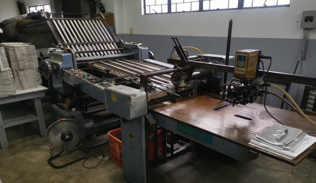A folding print machine (or paper folding machine) is used in the printing process to automatically fold printed sheets into the correct format. In a full printing workflow, this machine usually comes after printing and before binding, making it an essential finishing tool.